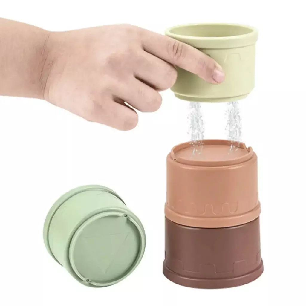 Cada vaso tiene pequeños orificios en la base que generan diferentes efectos de lluvia, ideales para la hora del baño o el juego sensorial con agua.