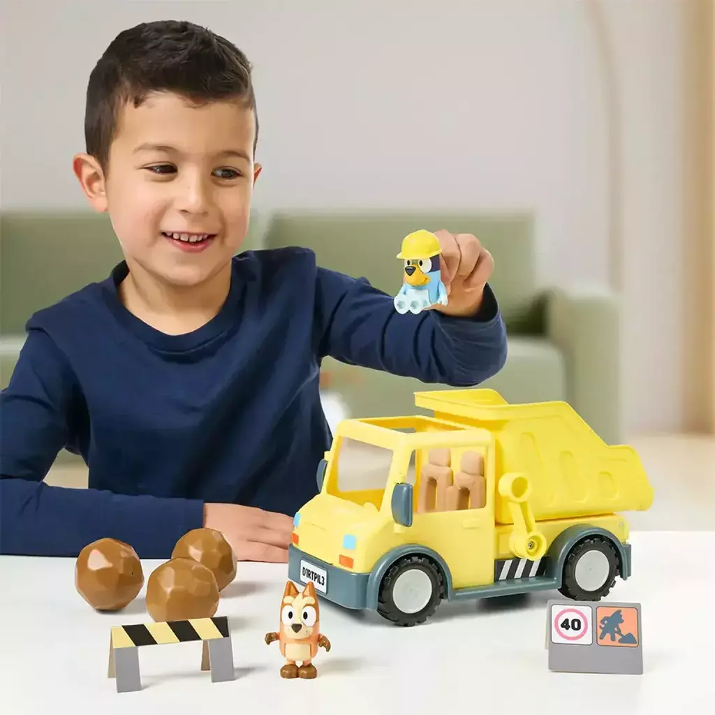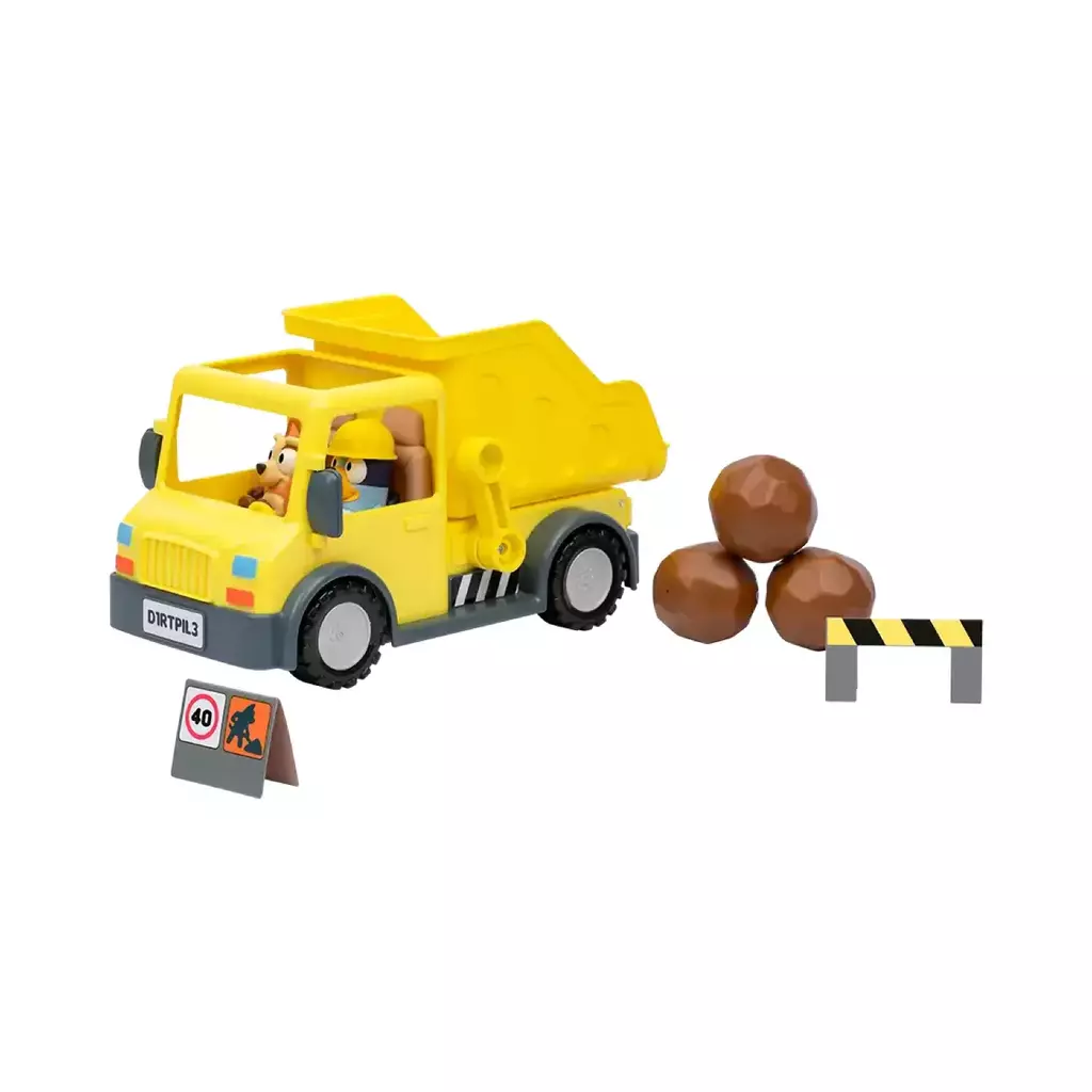 El Camión Volcador de Bluey incluye figuras exclusivas de Bluey con casco y Bingo embarrada, listas para cargar, transportar y descargar rocas con un realismo increíble.