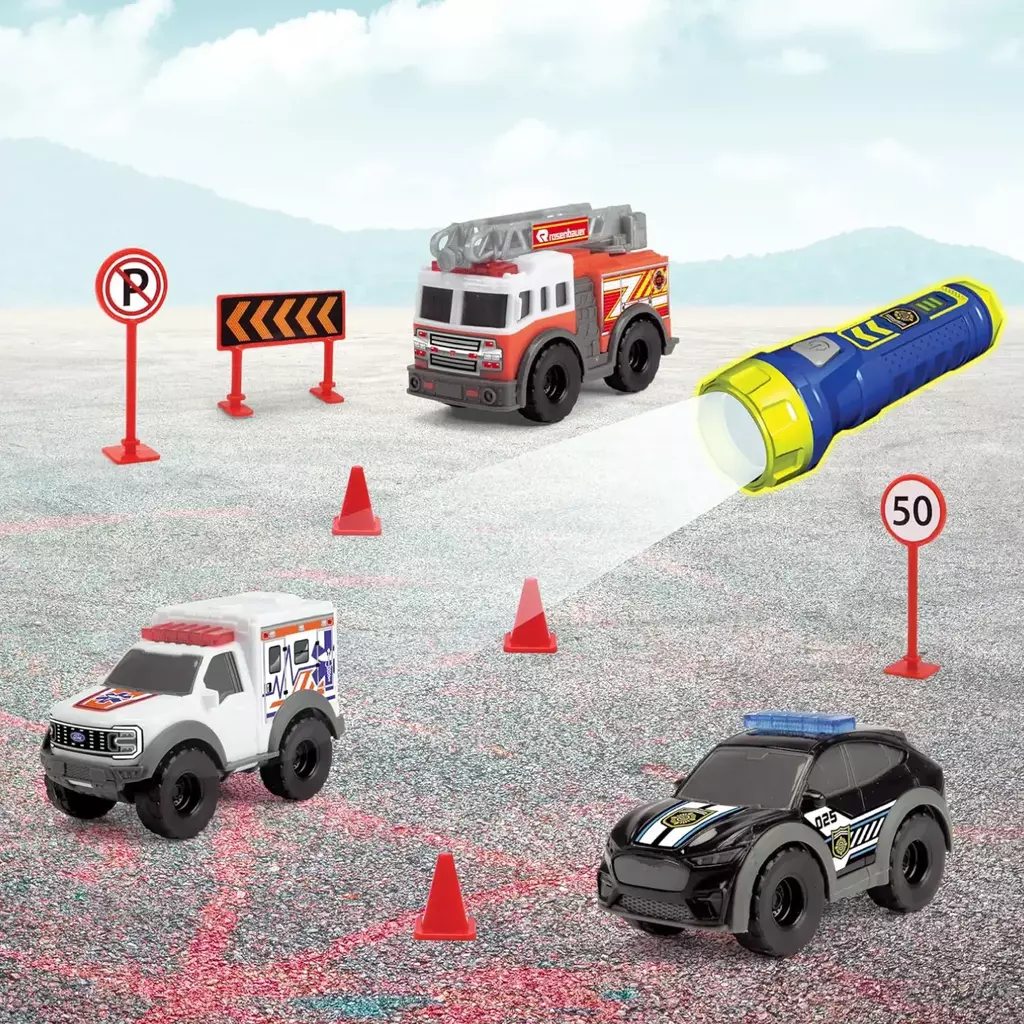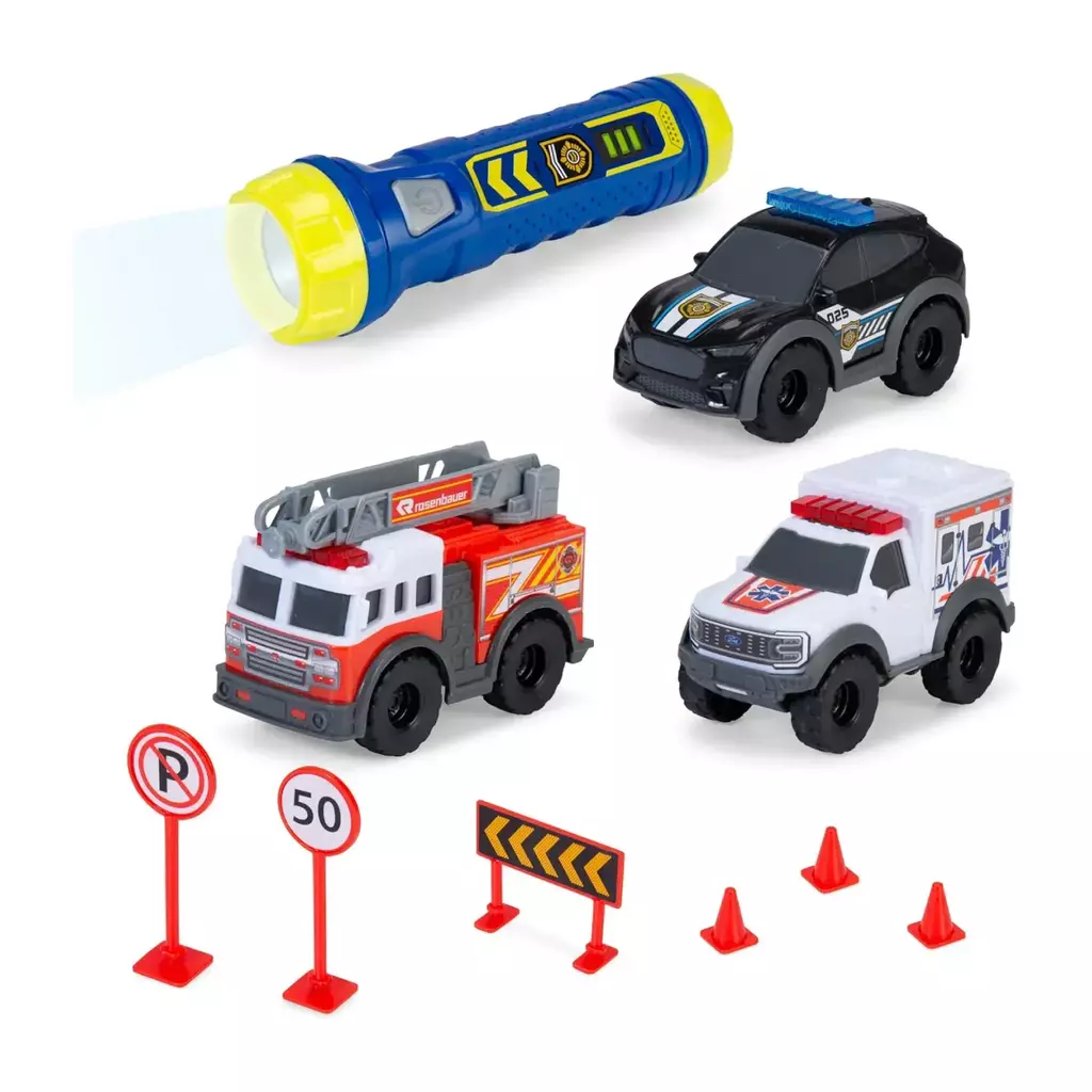 Jugá con el Micro SOS Playset que incluye 3 mini vehículos de rescate y una linterna LED de 14 cm, ideal para niños a partir de 3 años que quieren crear aventuras de emergencia y desarrollar creatividad mientras se divierten.