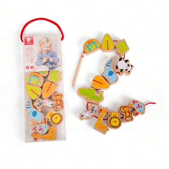 Incluye: 12 piezas de madera. Aguja para enhebrar de madera. Hilo.