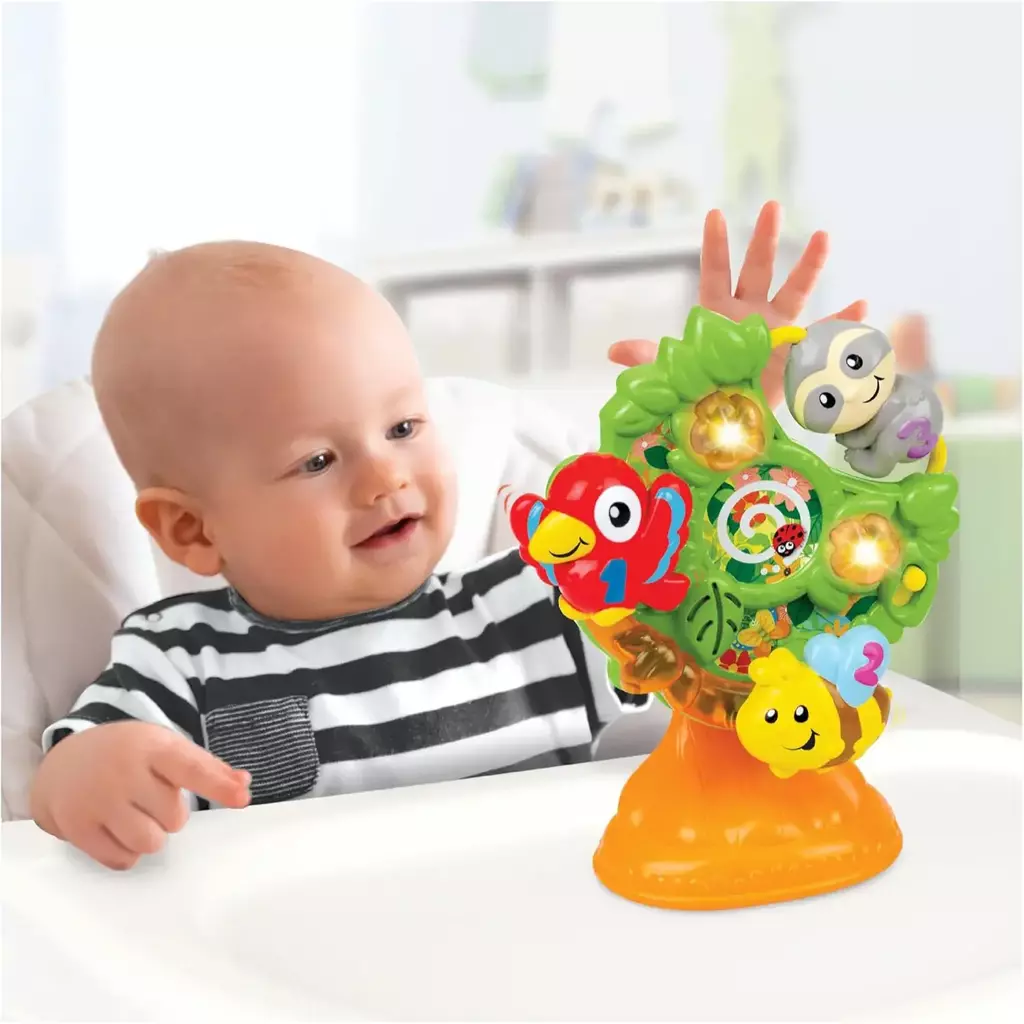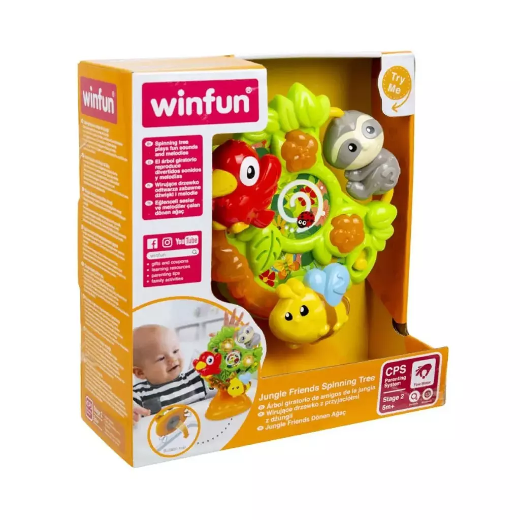 El Árbol Giratorio Amigos de la Selva de Winfun es un juguete interactivo con luces y música, ideal para bebés desde 6 meses. Giralo y escuchá melodías y sonidos divertidos mientras las luces parpadean. Incluye tres simpáticos personajes de la selva: un perezoso, un loro travieso y una abeja ocupada, que podés girar y presionar para activar luces y sonidos. Gracias a su ventosa segura, se fija fácilmente a superficies lisas como mesas o tronas.